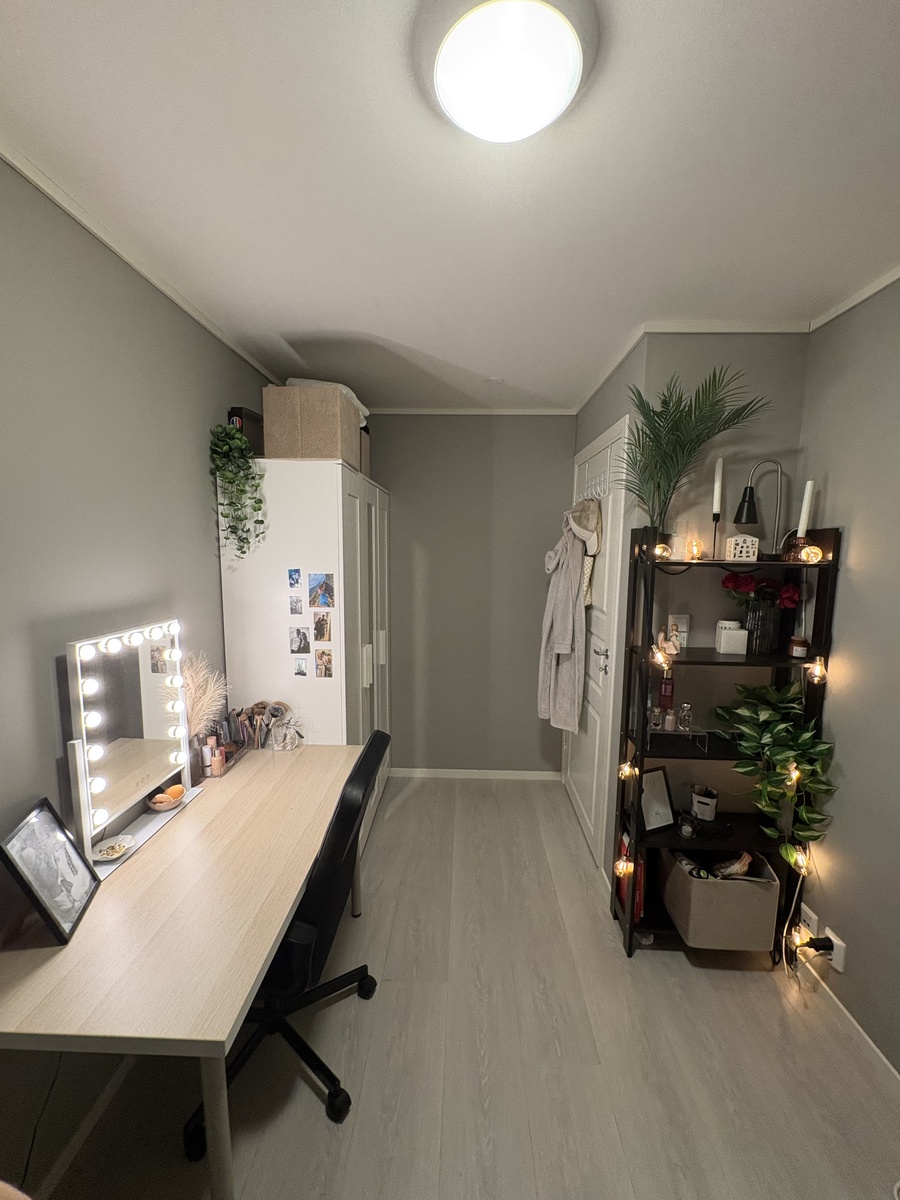 Møblert rom på 10 m² i er ledig fra 1.1!Rommet har seng, skap, skrivepult, hylle, nattbord og TV om ønskelig. Leiligheten er fullt møblert med felles stue, kjøkken og bad, og det finnes også en ekstra fryseboks.
