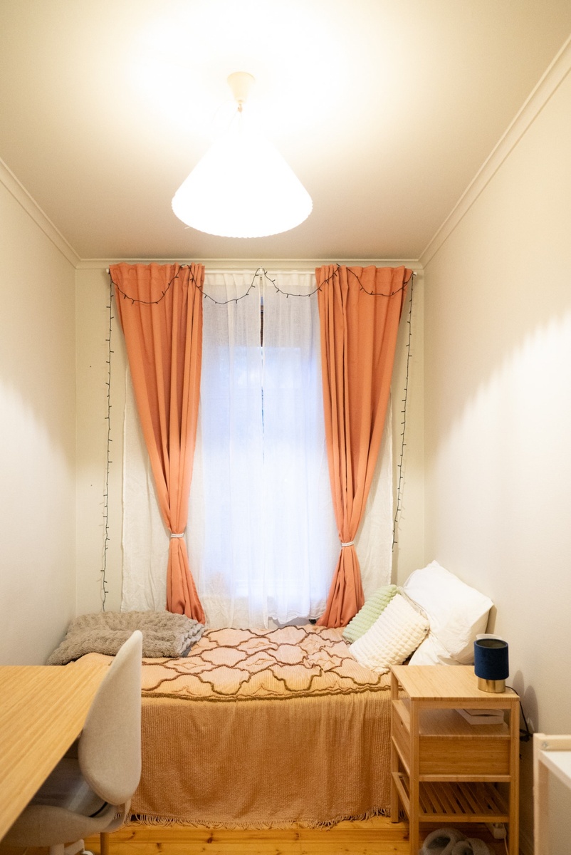 Rommet som leies ut er på ca 10 kvadratmeter og kommer innredet med et innebygd klesskap. Rommet har ellers plass til dobbeltseng, skrivepult og kommode/annet møblement - alt ettersom hvordan du ønsker å møblere. Vinduet på soverommet vender ut mot en rolig bakgård. Rommet er nymalt i 2025.
