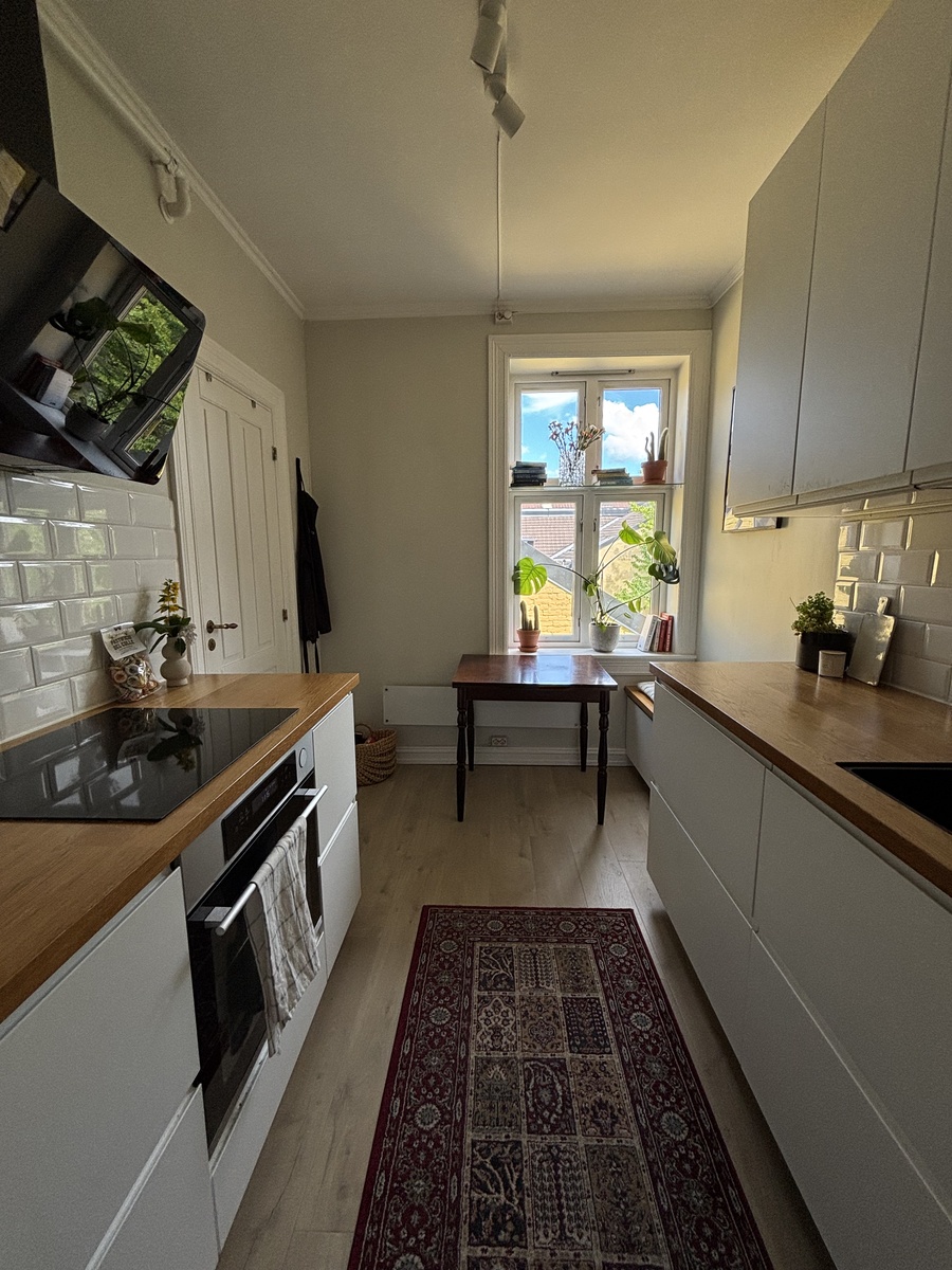 Kjøkken: Laminatgulv, godt med benkeplass og skapplass. Oppvaskmaskin, kombi-kjøleskap, induksjon-platetopp og komfyr. Enkelt å holde rent og jobbe på. Vindu mot bakgård.