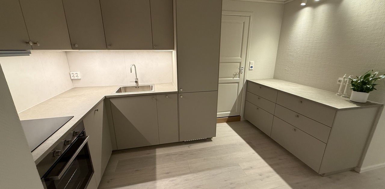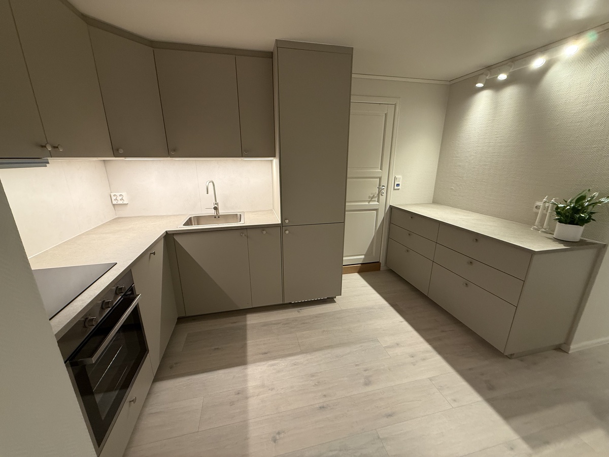 Leiligheten leies ut delvis møblert og består av en lys og romslig stue med tre store vinduer som gir godt dagslys og lite innsyn. Kjøkkenet er helt nytt fra 2025, og badet er nyoppusset med varmekabler samt direkte tilgang til eget vaskerom/bod.