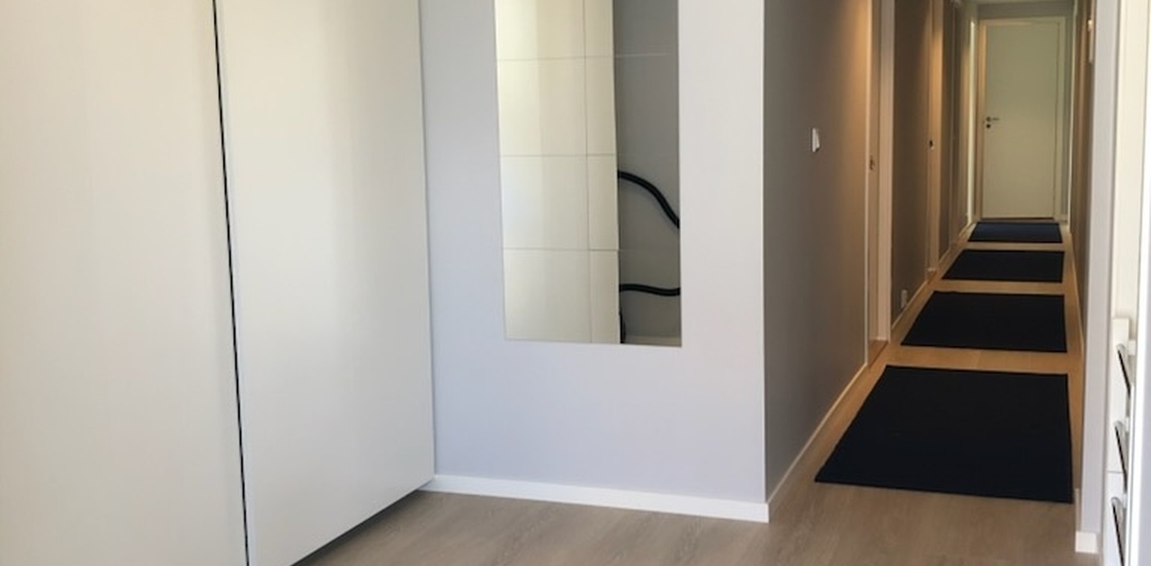 Stor entre med ekstra fryseskap samt skyvedørsgarderobe med god plass til klær og utstyr for 4 personer.