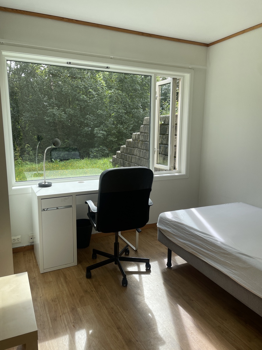 Etter litt endringer i planene står rommet mitt ledig i dette hyggelige kollektivet fra 1.januar! Kollektivet består for øyeblikket av to andre trivelig NTNU-studenter, og det tredje rommet står ledig (det er mulig å flytte inn før 1.januar hvis ønskelig). Rommet har stort vindu med utsikt til trærne utenfor, og ligger svært nært både Bymarka, bussholdeplass, trikk, flere matbutikker og apotek. Det tar ikke mer enn 15 minutter fra døra til sentrum med buss 3 som går ofte, og direkte til Gløshaugen, St. Olavs hospital, studentersamfundet og Dragvoll. Leiligheten er derfor nokså sentral, samtidig som man har umiddelbar nærhet til Bymarka med flott turterreng og skiløyper.