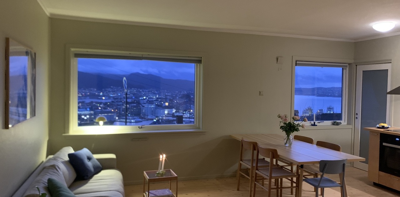 2-roms med moderne kvaliteter, nydelig utsikt og praktfull beliggenhet mellom byfjellene og sentrum. Perfekt for par. Nydelig gulv i heltre. 5 min gange til sentrum. Fantastiske turmuligheter med 5 min gange til Fjellveien og ca 30 min gange til Fløien. Peisovn. Rolig nabolag. Fleksibel leieperiode. Internett, kabel-TV og fellesutgifter er inkludert i leien. Leies ut møblert. Tilgang til bod. Høy 1. etasje. Eget sykkelrom.