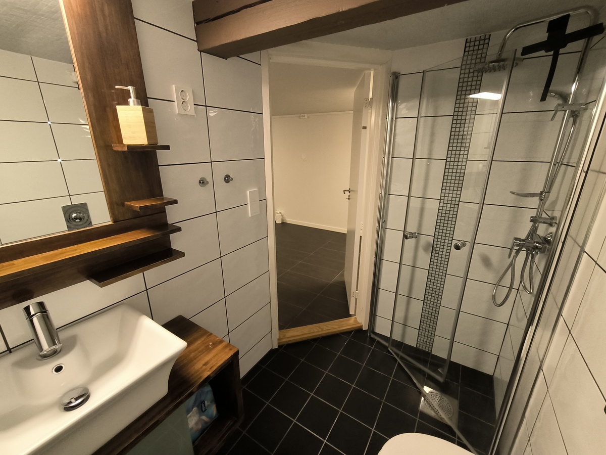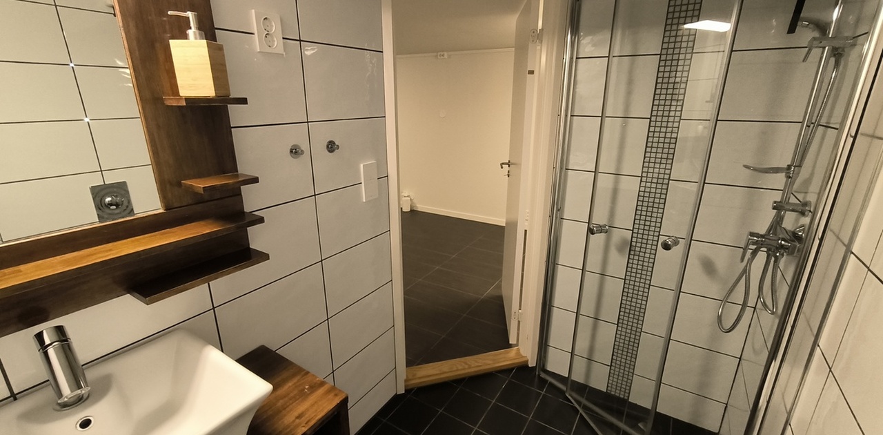 Moderne bad med fliser, dusj, servant og vegghengt toalett