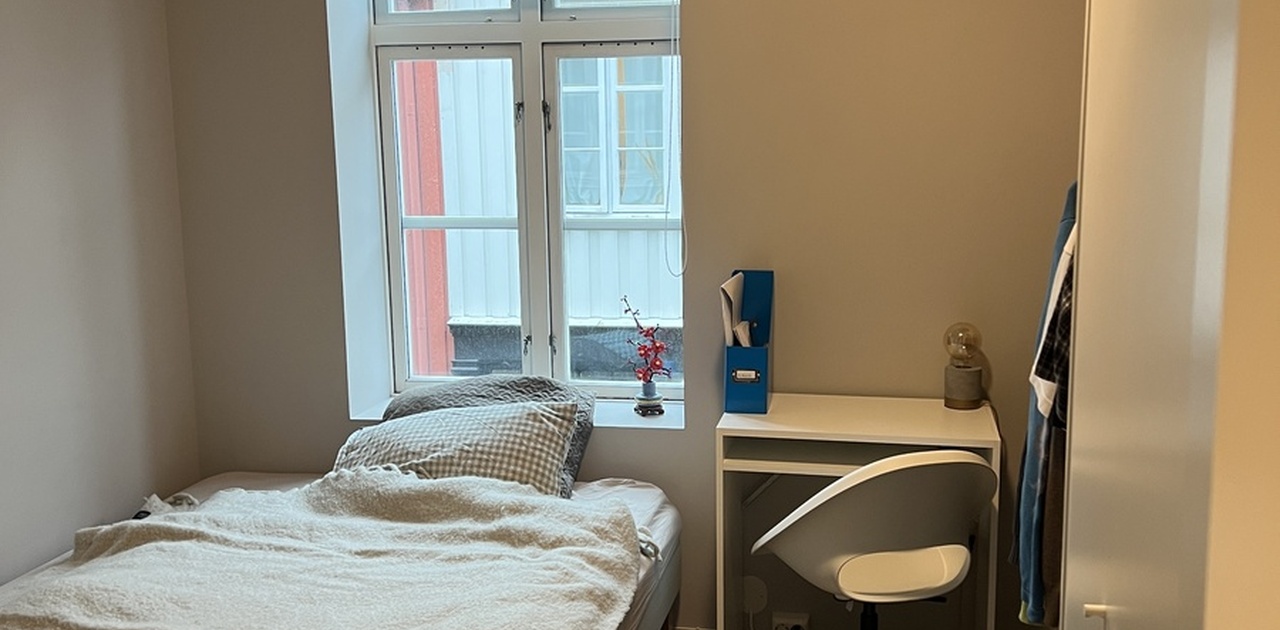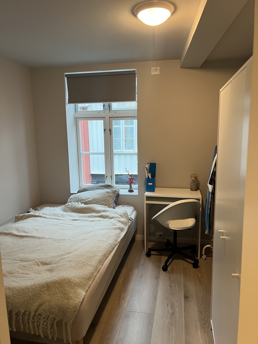 I’m renting out my room in a friendly and social shared apartment located in the heart of Trondheim city center, as I’m going on exchange. The room is about 7 m² and comes furnished with a 140 cm bed, desk, chair, clothing rack, and wardrobe.