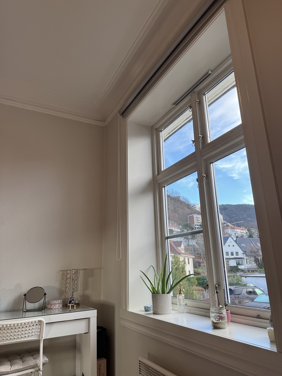 Det ledige rommet er lyst og romslig, med et stort vindu og god lagringsplass (også i høyden!). Rommet er delvis møblert med seng, klesskap og speil!