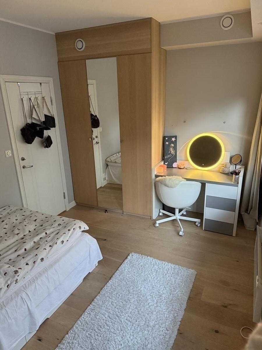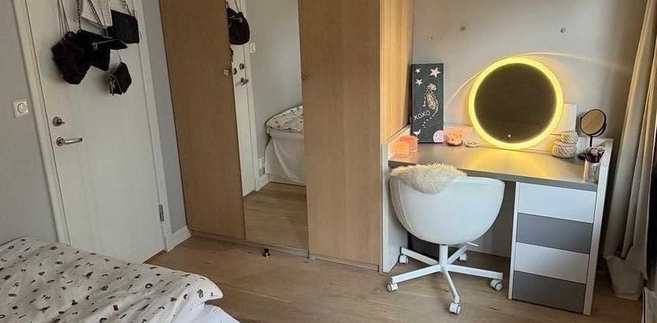 Leien er 6 950 kr per måned, og inkluderer alle møbler og internett. Strøm kommer i tillegg.