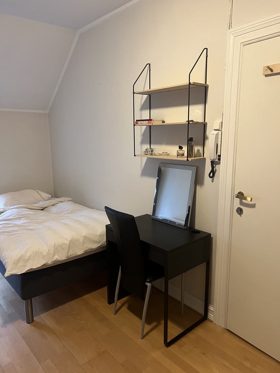 Hybelen er møblert med seng, pult, kommode, skap og en behagelig stol. Downlights i gang. Bad med fliser og varmekabler. Miele vaskemaskin på bad. Tørketrommel. Egen calling med lyddør til hybelen fra gaten. 2 mnd depositum og 3 mnd oppsigelse. Minimum leietid er et halvt år (til august).