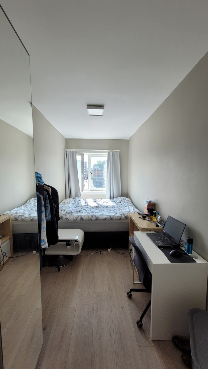 Rommet er ikke stort, men du vil ha plass til det nødvendige. Jeg har selv fått inn en dobbeltseng og pult, en liten hylle til oppbevaring og klesskap + stativ. Rommet leies ut uten seng, men klesskapet, klesstativet og pulten kan stå igjen hvis ønskelig.