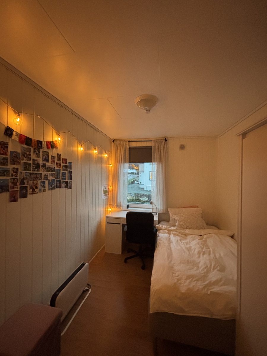 Rom på ca. 8 m² fremleies i et kollektiv i andre etasje i bolig. Rommet leies ut møblert med seng, skap og skrivebord. Leiligheten har stort kjøkken som deles med 5 studenter ved NTNU, med god plass: ½ kjøleskap per person, ekstra fryseplass i gang og rikelig med skapplass. Kollektivet har 2 bad, hvorav ett stort bad med vaskemaskin, tørketrommel og kombimaskin.