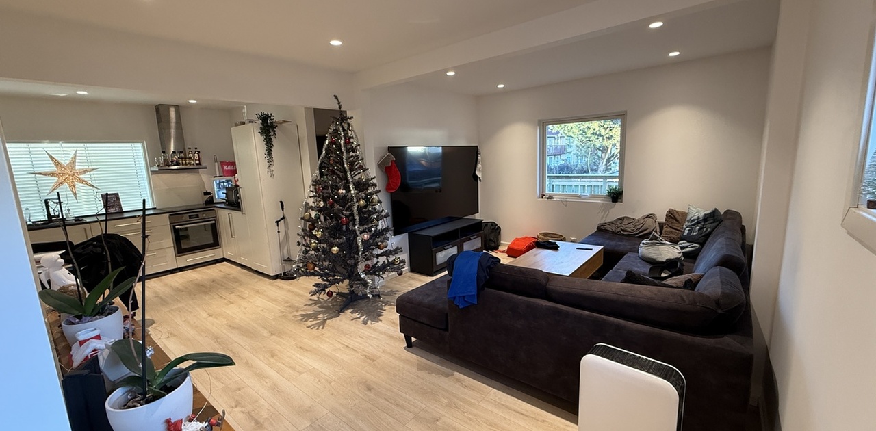 Lys og moderne leilighet i vertikaldelt enebolig, fordelt over to etasjer. Boligen er nylig totaloppusset, og fremstår med gjennomgående moderne standard og en praktisk planløsning.