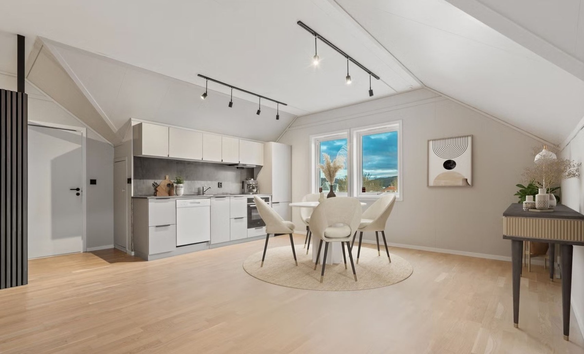Romslig og lys toppleilighet på Hauge leies ut ferdig møblert, svært godt egnet for kollektiv (4 personer).