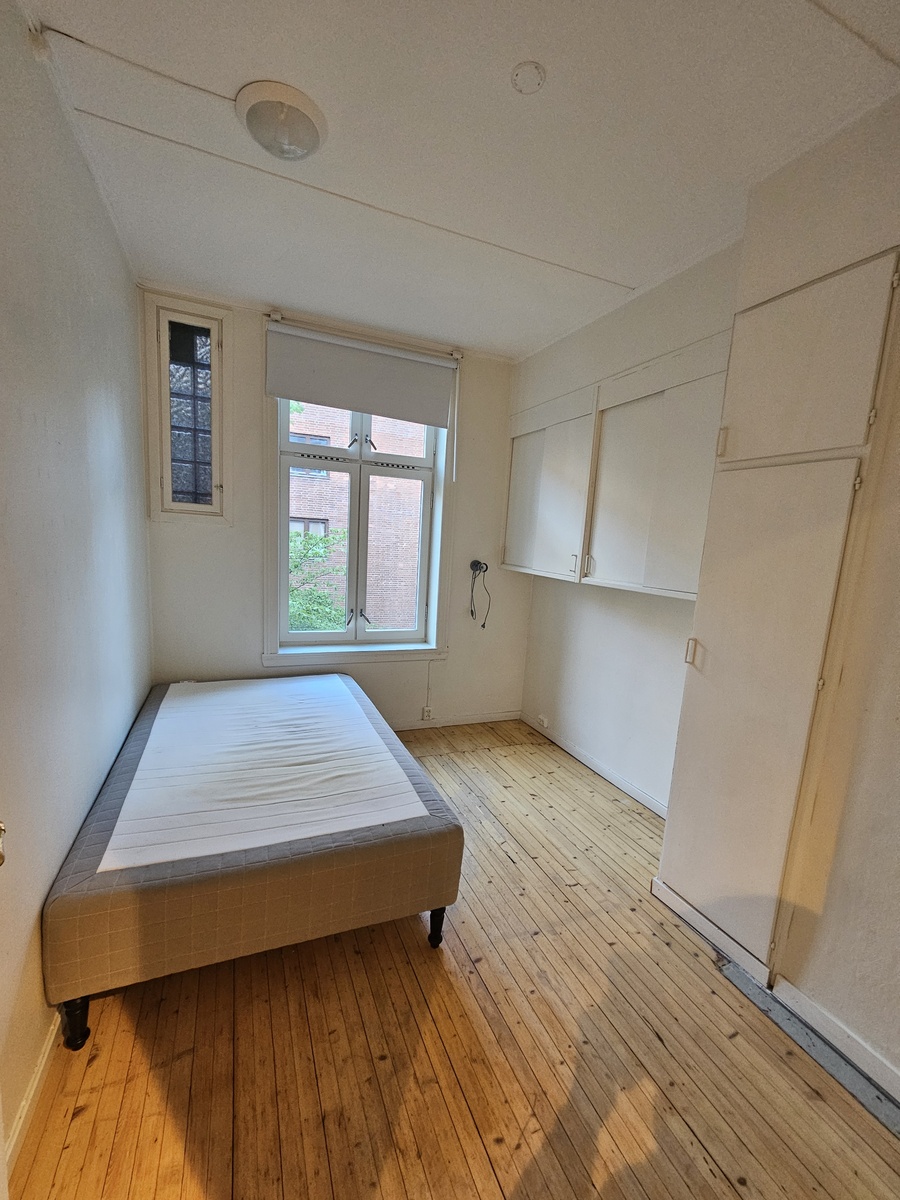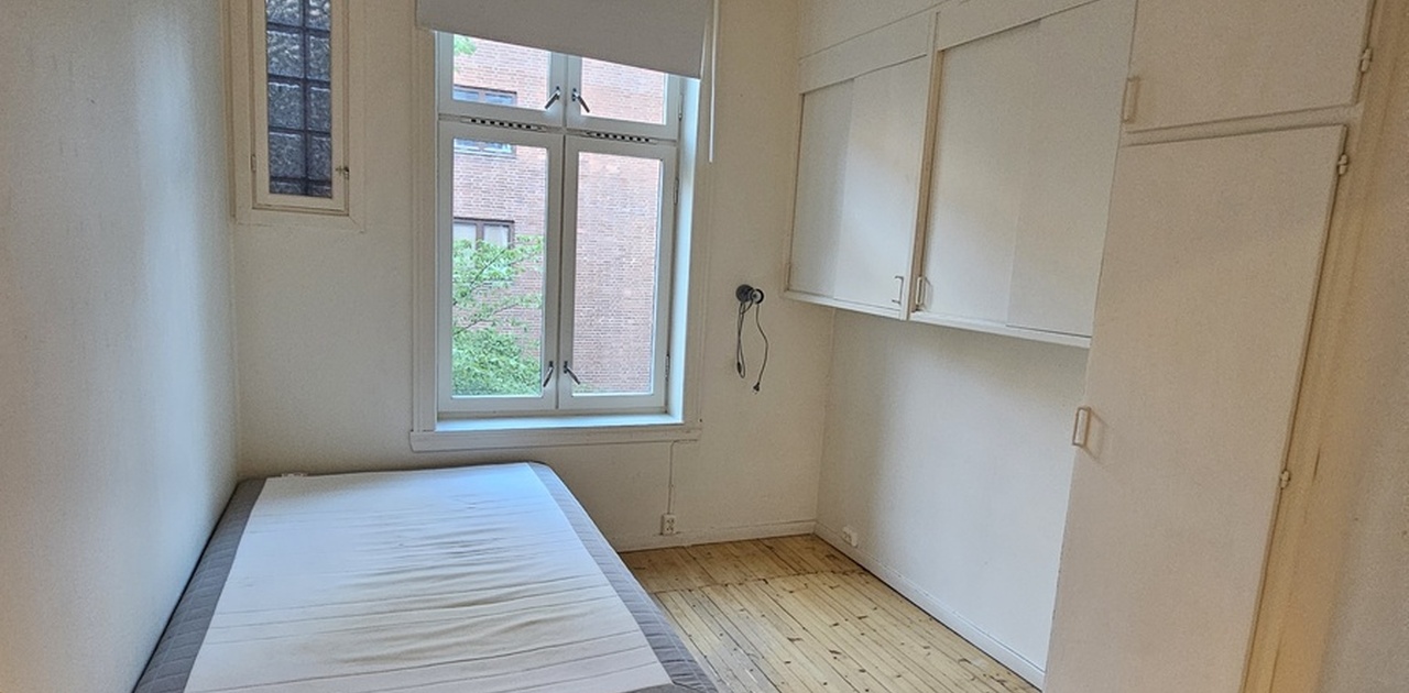 Rommet er ca. 10 kvadratmeter og vender mot rolig bakgård. Det er innebygde hyller på veggene og et lite skap. 120-sengen følger med, men rommet er ellers umøblert.