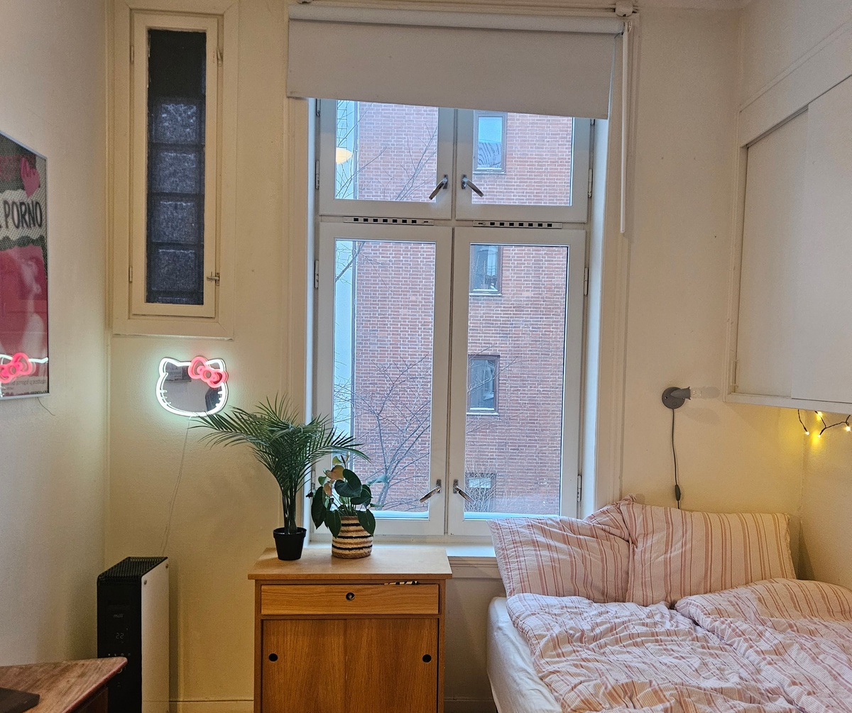 Rom nr. 1 er ca. 10 kvadratmeter og vender mot rolig bakgård. Det er innebygde hyller på veggene og et lite skap. 120-sengen følger med, men rommet er ellers umøblert. Rommet er ledig fra 16.02 med ønsket innflytting innen 01.04.