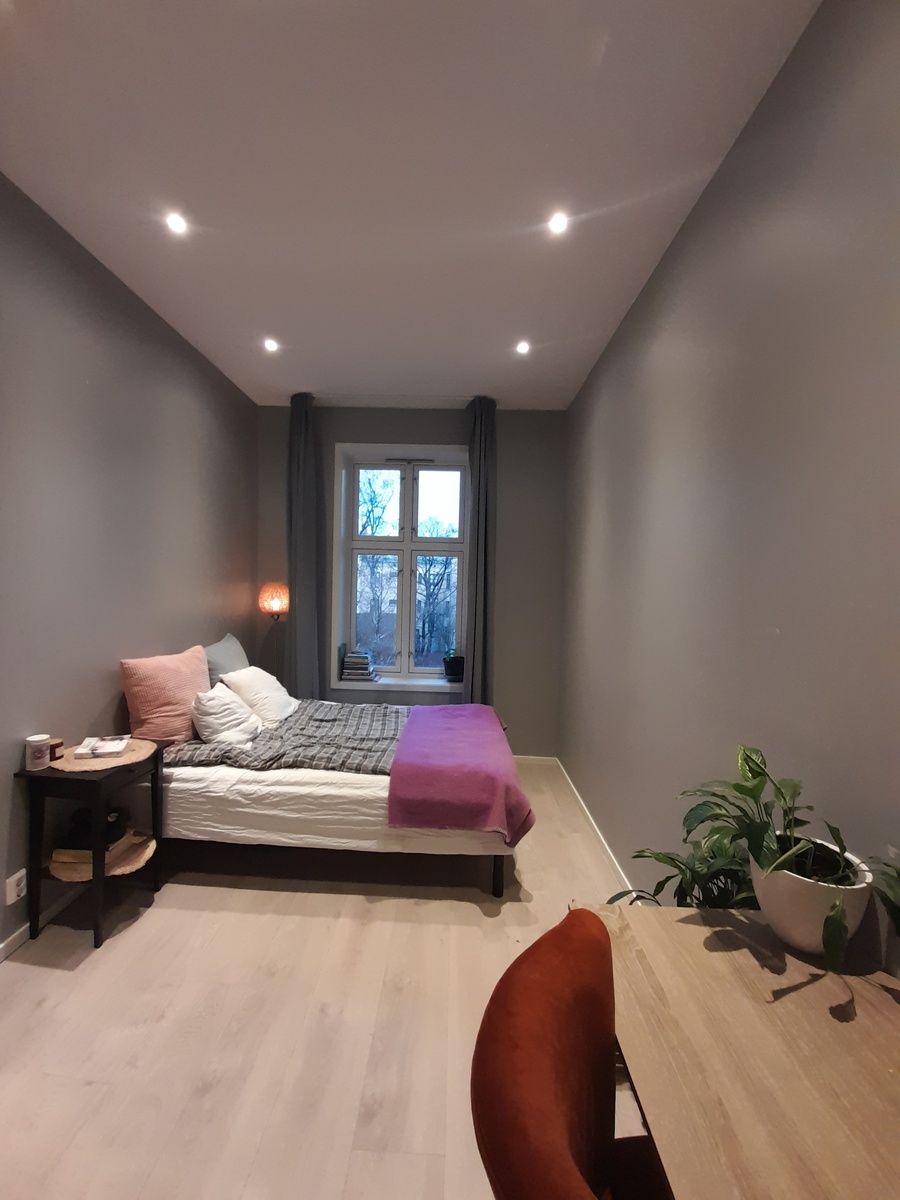 Rommet er lyst og romslig, vendt ut mot bakgården. Med andre ord så slipper man både støy og bråk, samt frykten at noen ser inn i rommet! Det er godt med plass til skap, skrivebord, seng, tv, hylle ++. Sengen på 140cm x 200 cm med overmadrass følger med, og er ekstremt komfortabel (skulle gjerne tatt den med hvis det var mulig!). Skapet, speilet, gardinene og panelovnen blir også værende. Skrivebord, stol, nattbord, dørhenger og kleshengere kan evt. kjøpes dersom det er ønske for det:)