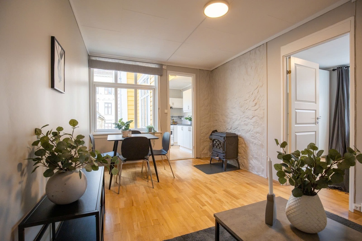 Midt i byen, men tilbaketrukket fra gaten, stille og rolig - lekker og nyrenovert toroms leilighet - ledig fra 1. januar-26.