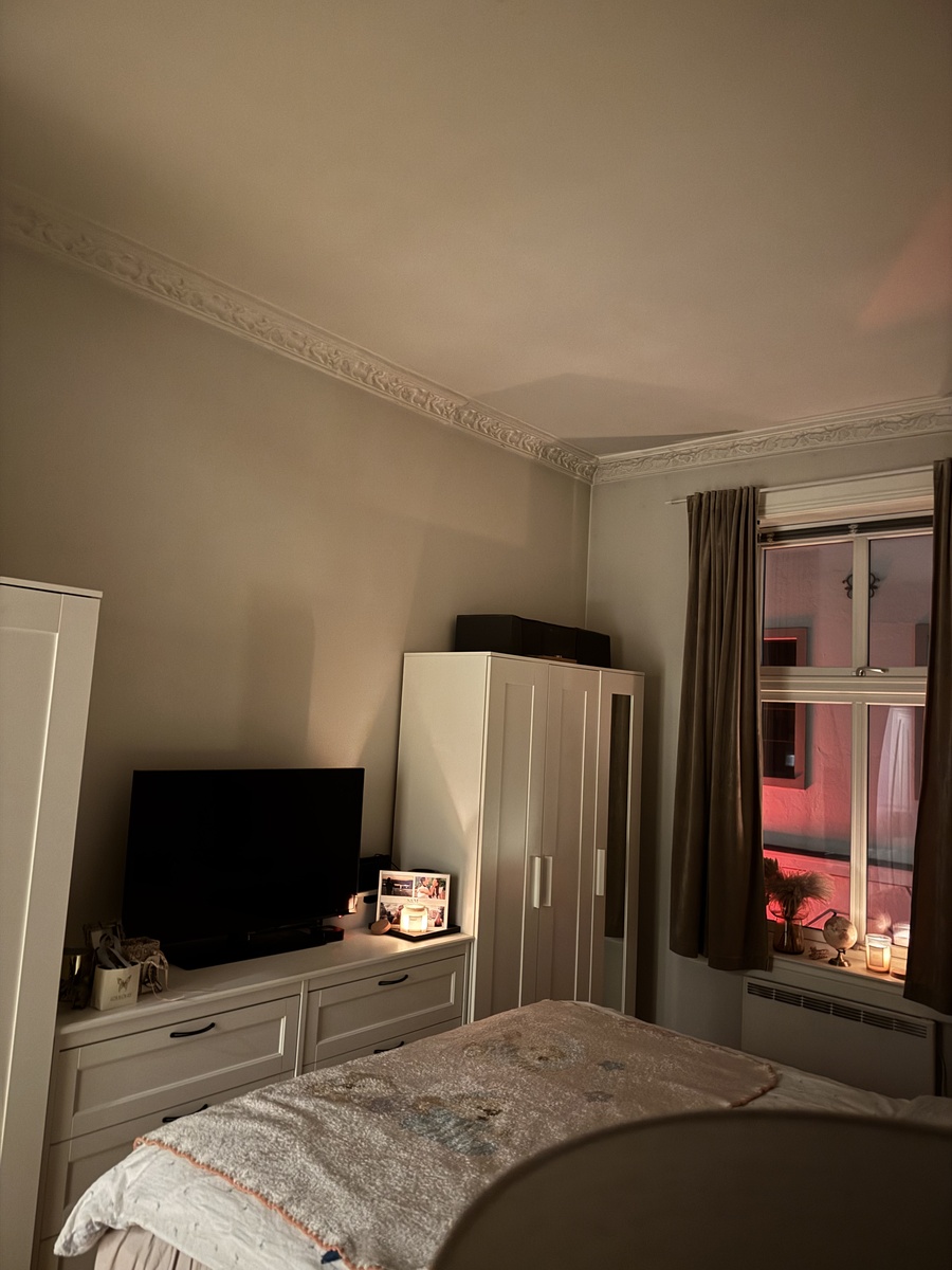 Leiligheten har en lys og behagelig atmosfære, med god takhøyde og fine fellesarealer. Rommet som leies ut er romslig, umøblert og har god plass til både seng, oppbevaring og skrivebord.