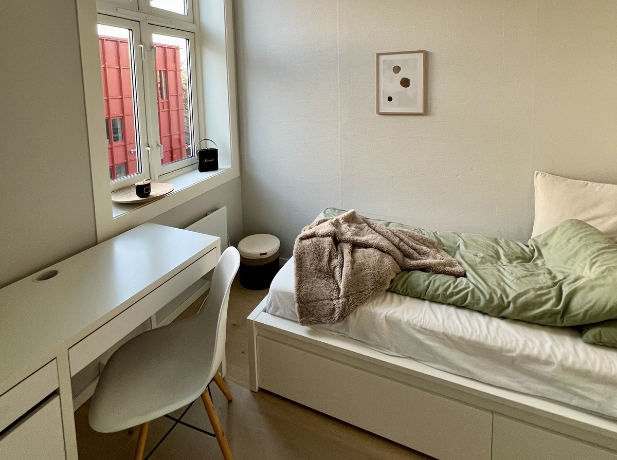 Det er soverom #3 på plantegningen, det er veldig lyst og funksjonelt. Både leiligheten og soverommet leies ut fullt møblert; 90cm seng med lagring under, mindre klesskap og skrivebord (+ evt. stol).