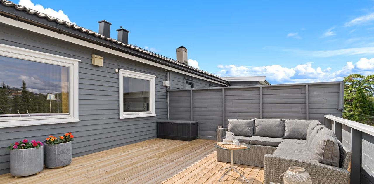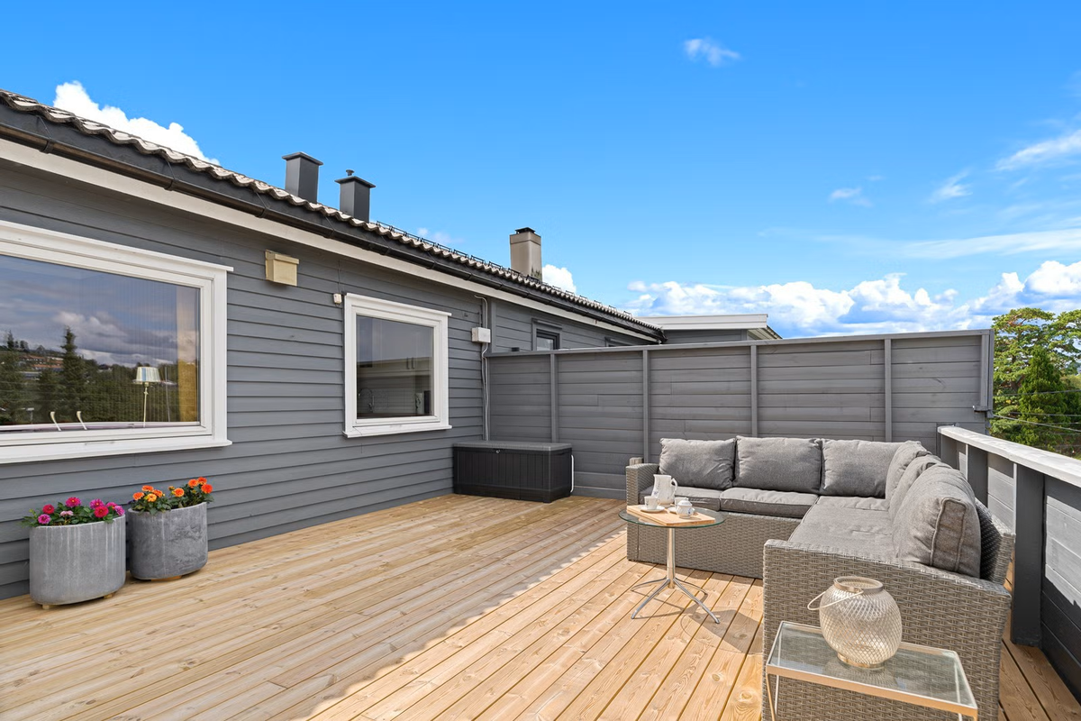Rekkehuset er fordelt på 2 etasjer og 125kvm. Av innhold kan det nevnes en lys og romslig stue m/peis og spisestue, kjøkken m/ god oppbevaringsplass, 5 soverom, flislagt bad, praktisk vaskerom og god oppbevaringsplass i boder og bortsettingsloft. Utvendig er det flere terrasser i ulike størrelser i tillegg til en skjermet hage der du kan nyte solfylte dager i rolige omgivelser. Det medfølger garasje i rekke i tillegg til egen parkering ved inngangspartiet.