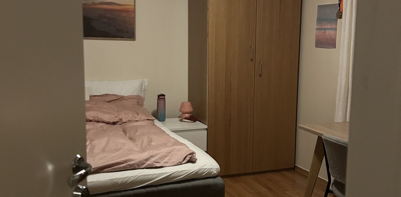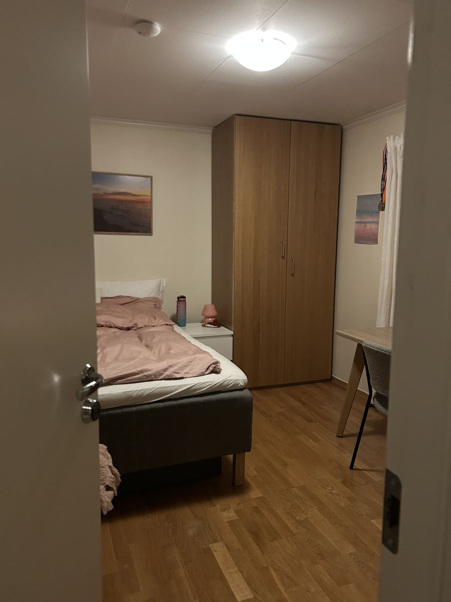 Rommet er på ca.11 kvadratmeter og har god plass! Klesskap og kjøleskap følger med og senga kan kjøpes med billig Ledig fra 1.januar!!