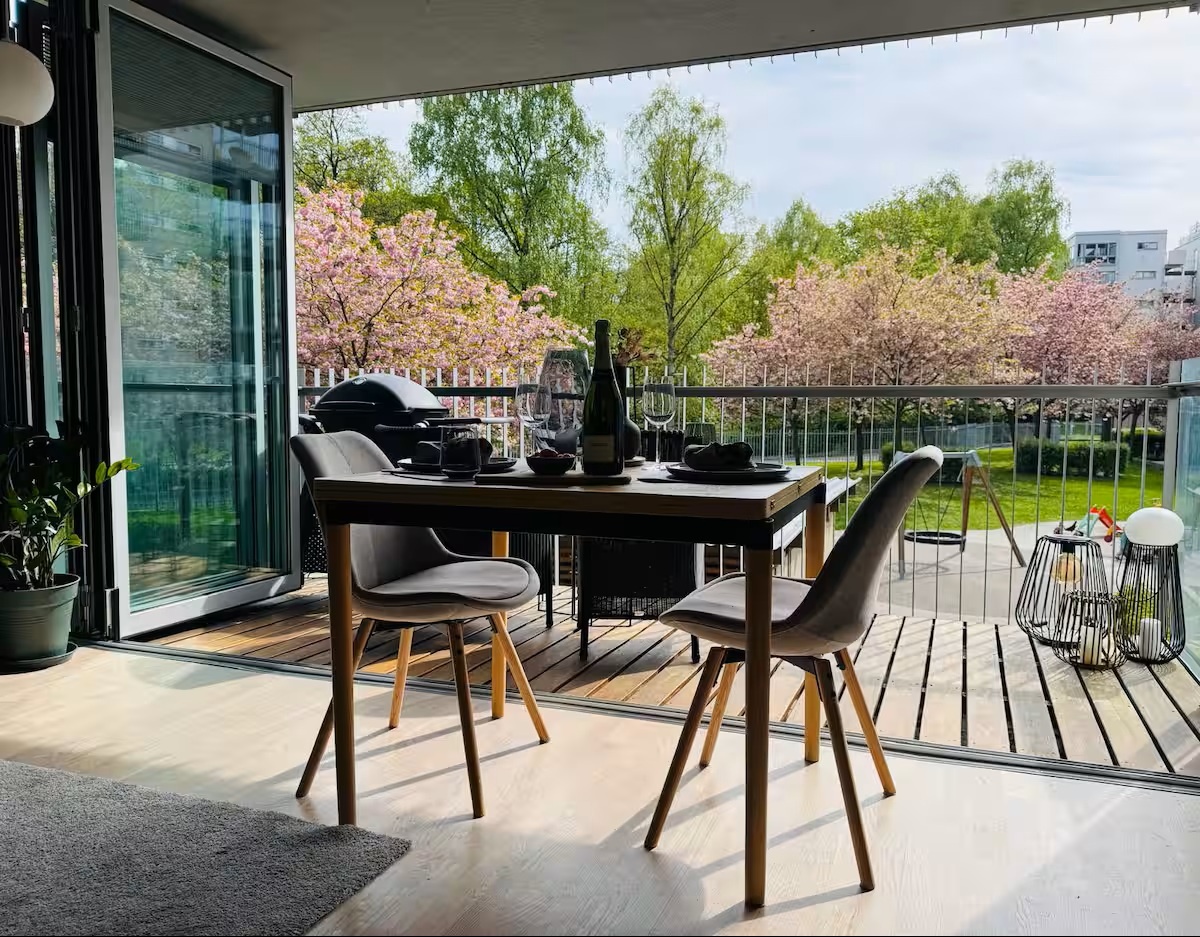 Nyrenovert leilighet med designdetaljer og foldbare glassvegger ut mot den store balkongen.