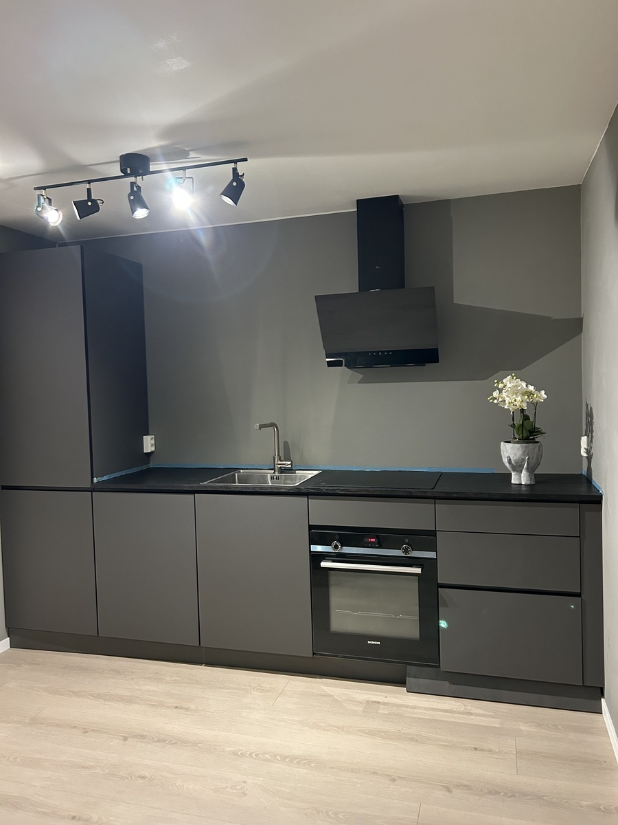 Delvis møblert med hvitevarer (kjøl/frys, stekeovn, komfyr, oppvaskmaskin og vaskemaskin med tørketrommel)