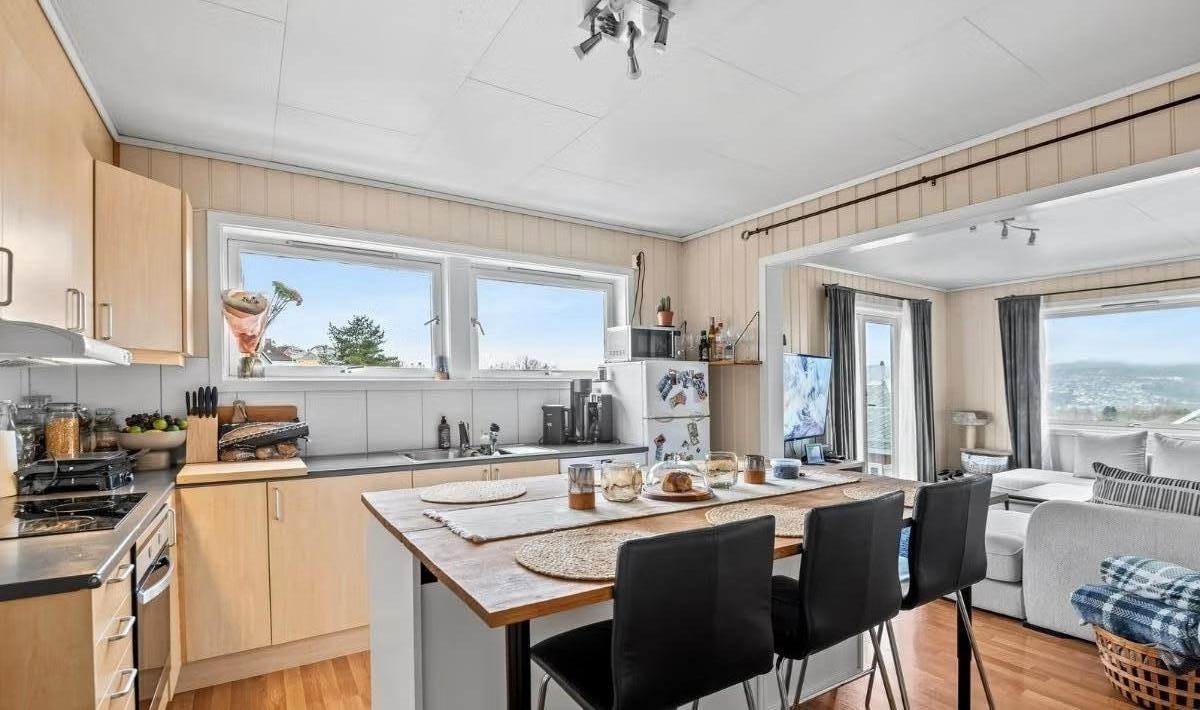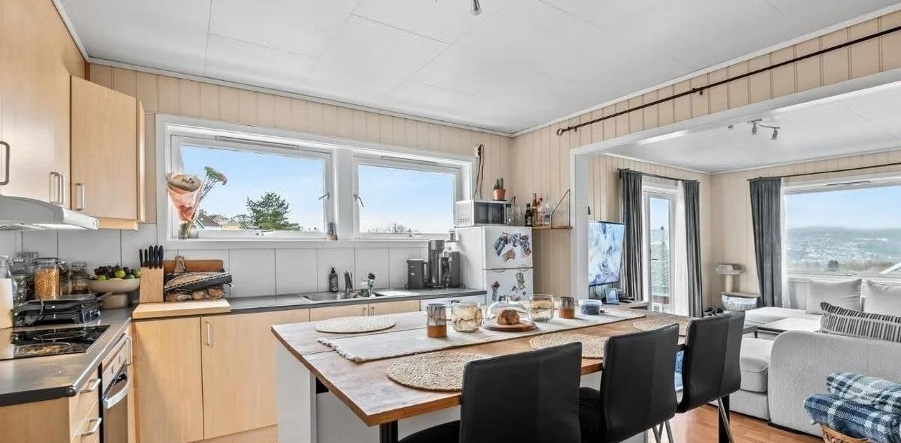 Leiligheten holder en gjennomgående god standard med store vinduer, lyse flater og en luftig atmosfære.