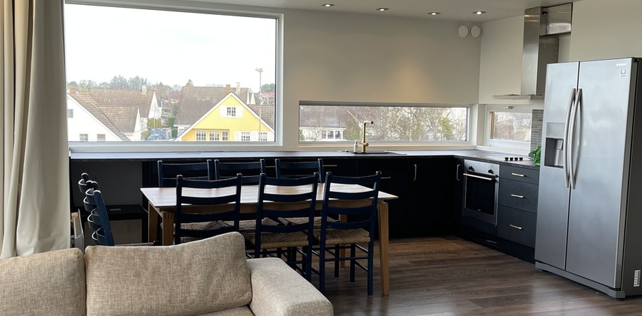 Leiligheten har et rolig preg, gode solforhold og flott utsikt. Store vindusflater gir rikelig med naturlig lys gjennom hele dagen.