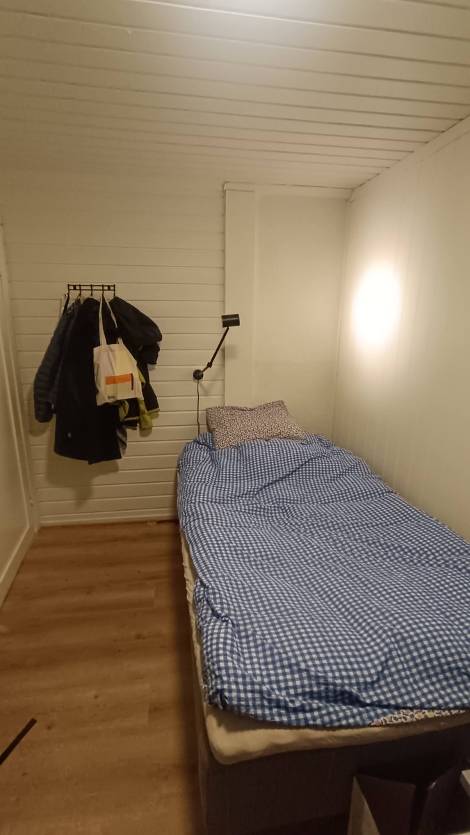 Rommet er 8.5 km^2 og utstyrt med varmeovn og klesskap. Seng og bokhylle kan diskuteres.