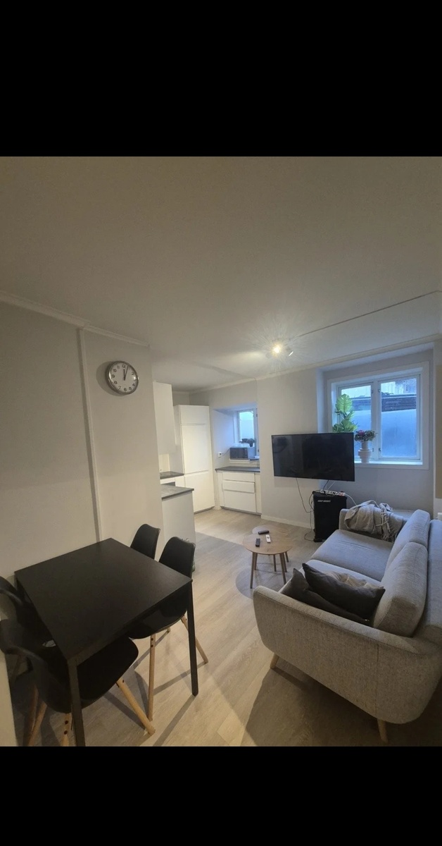 Leiligheten har en koselig stue med sofa, TV og spisebord, i tillegg til et kjøkken som er utstyrt med det man trenger av redskaper. Badet deles mellom beboerne. Det er altså alt på plass for å flytte rett inn, uten å måtte tenke på å skaffe møbler.