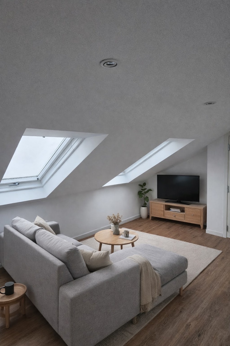 Leiligheten har mange takvinduer som kan åpnes, og som gir mye lys. Det er blendegardiner på dem alle. Leiligheten har brannslukningsapparat, brannvarsler og egen brannutgang med brannstige.
