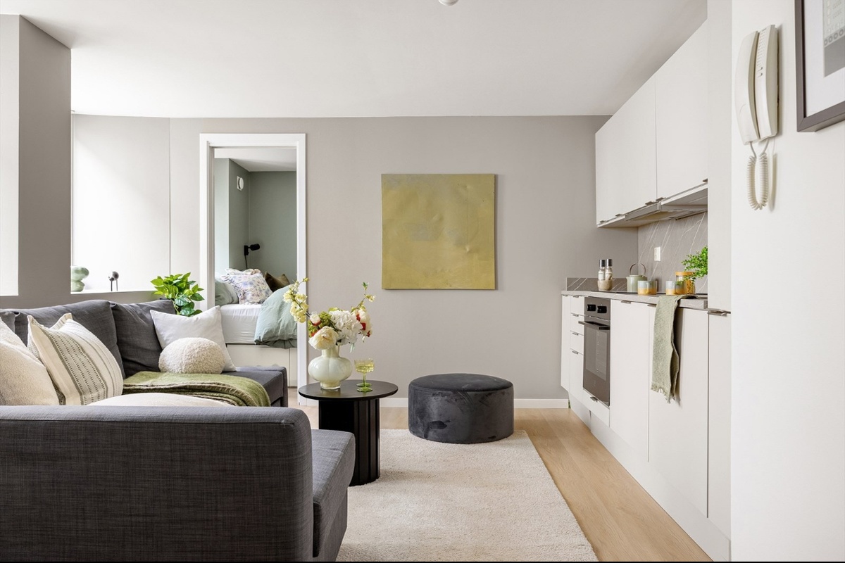 Stuen er lys og luftig med gode møbleringsmuligheter, og ligger i åpen løsning mot et stilrent kjøkken med integrerte hvitevarer. Soverommet er romslig og har plass til dobbeltseng og oppbevaring. Badet er pent og funksjonelt.