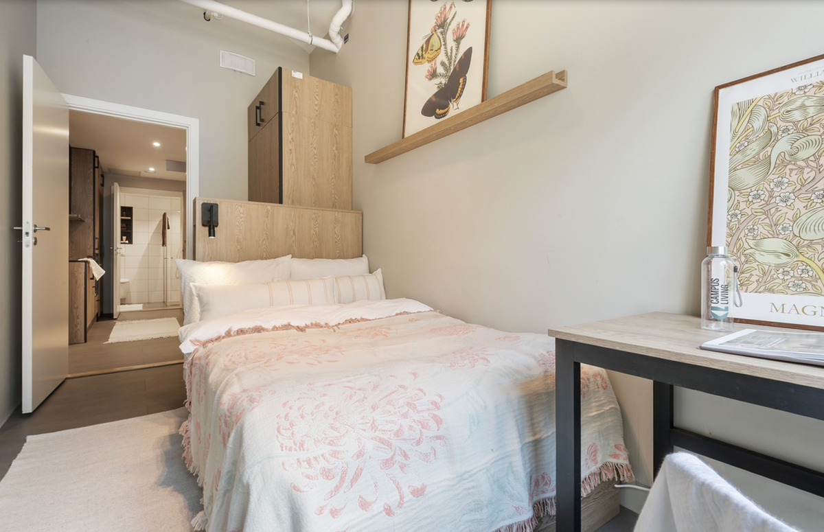 Rommet er lyst og innbydende med god plass, og sengen har integrert oppbevaring under madrassen. Skrivepult med stol og hyller gjør det enkelt å organisere både skolearbeid og fritid. Internett er inkludert, så du kan plugge inn og jobbe eller streame med en gang.