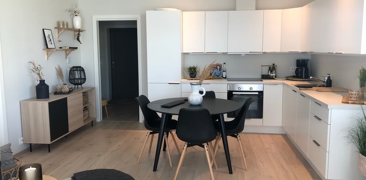 Ny flott leilighet i 1. etg. til leie. Fullt møblert. Stor privat terrasse med sol.