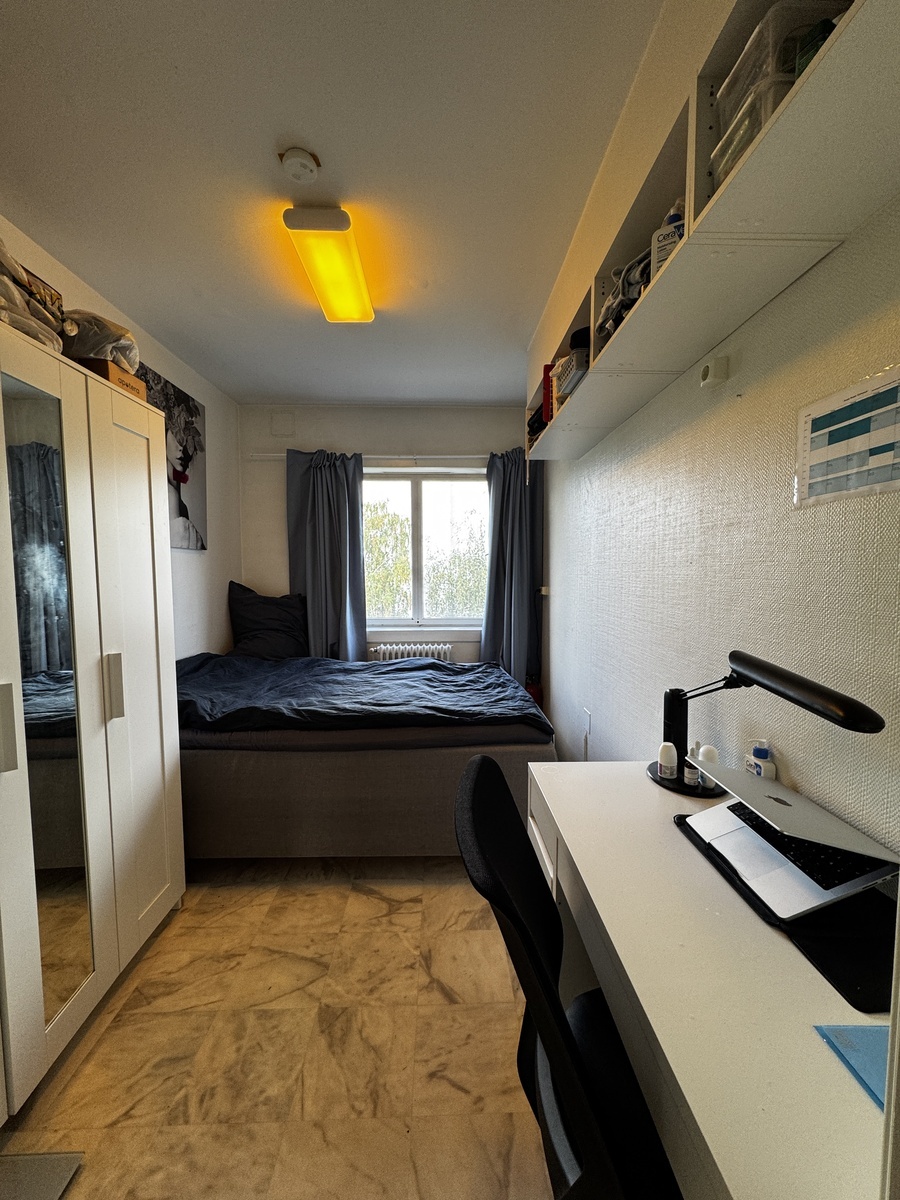 Rommet er delvis møblert med stort klesskap og skrivebord. Leiligheten har felles stue/kjøkken med oppvaskmaskin og to kjøleskap, bad med vaskemaskin, separat toalett og en romslig balkong med gode solforhold.
