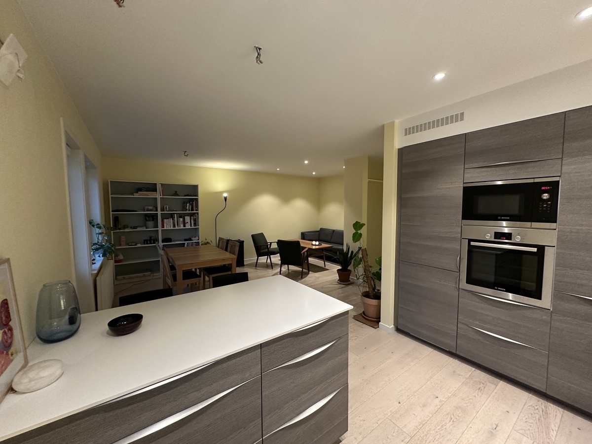 Rommet er ikke møblert, men kan møbleres med seng hvis ønskelig. Resten av leiligheten er møblert, og kjøkkenet har det meste av nødvendig utstyr.