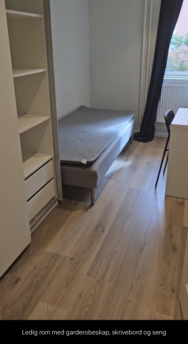 Rommet som leies ut er 9 kvadrat. Rommet er utstyrt med seng, skrivebord og god skapplass med skyvedørsgarderobe på 1,5m.