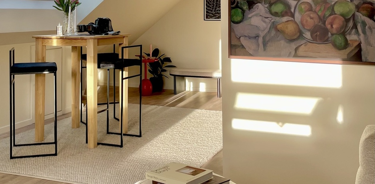 Kjøkkenkroken er utstyrt med kjøleskap, induksjonstopp, airfryer og nødvendig kjøkkenutstyr. Det er ikke stekeovn, oppvaskmaskin eller vaskemaskin i loftdelen. Det kan avtales tilgang til vaskemaskin én fast dag i uken i husets vaskerom, som har egen inngang på bakkeplan.