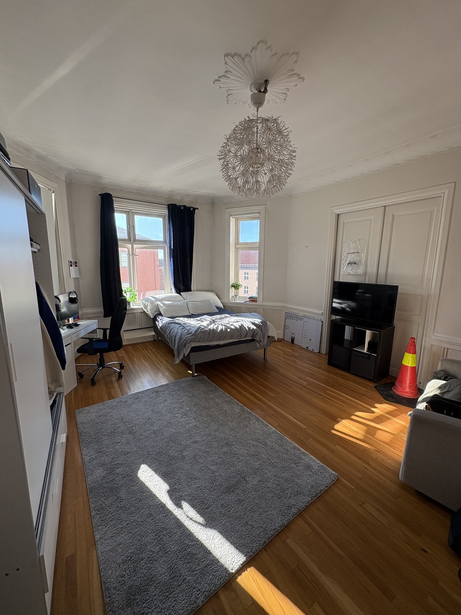 Rommet er stort og fleksibelt, samt fult møblert med seng, sofa, skrivebord og klesskap. TV inkluderes også.