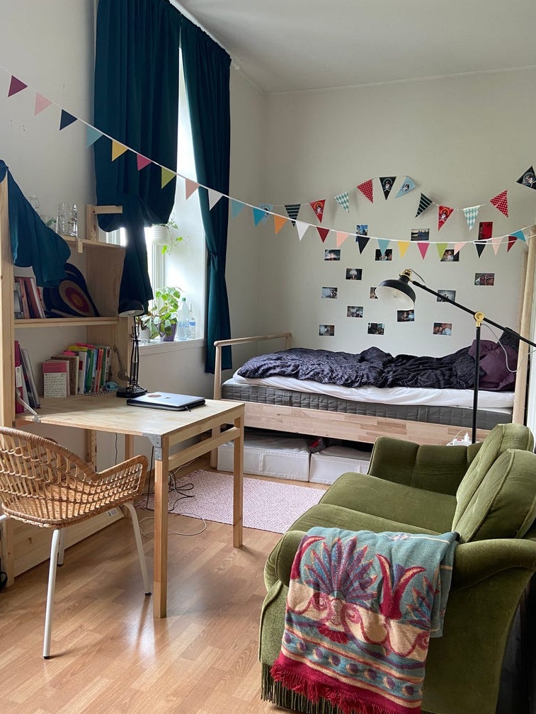 large apartment, you have access to a hallway, shared kitchen and two bathrooms with shower and toilet in both. There is no living room, but all have large rooms that make up for it. The room itself is large and shaped like an "L". The ceiling height is very high and gives the whole apartment a spacious feeling. The cabinet can be put back :)