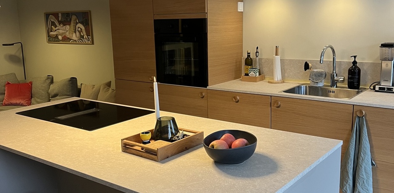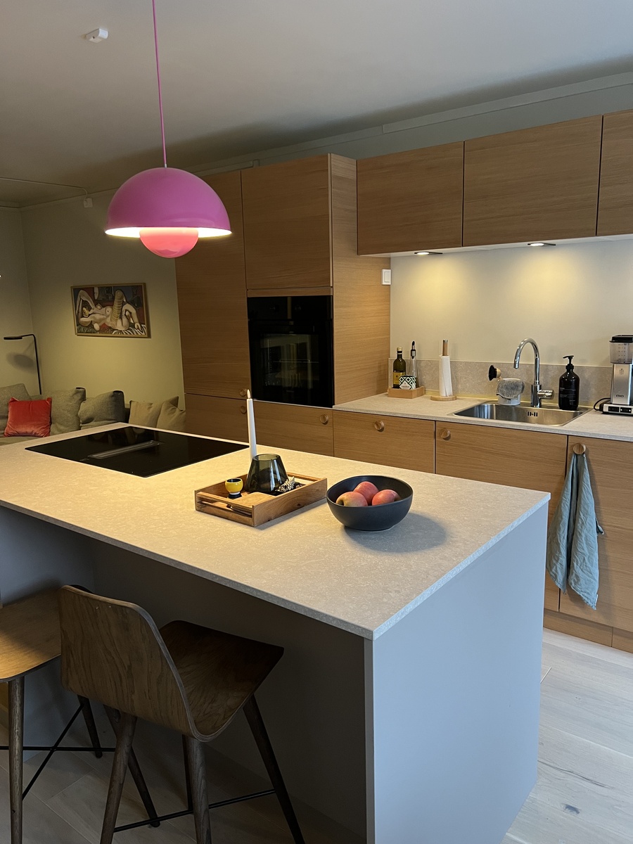 Leiligheten består av gang med innvending bod, kjøkken/stue, bad, soverom og en markterasse på 24kvm. Leiligheten ble renovert vinteren 2025 - fagfolk utførte helsparkling og maling av flater i gang, kjøkken/stue og soverom, parkettgulv i stue/kjøkken og soverom, samt innsetting av nytt kjøkken fra Kvik. Det elektriske anlegget ble også oppgradert. Kjøkkenet inkluderer kjøkkenøy og har god benkeplass, kjøleskap og frys, oppvaskmaskin, induksjon koketopp med nedtrekksvifte og stekeovn. Soverom med dobbeltseng (180x200cm). Sofahjørne med TV og høyttaleranlegg. Flislagt bad med dusjkabinett. Gangen er flislagt, med et garderobeskap samt innvendig bod. Markterasse på 24kvm, skjermet ut mot baksiden av leilighetskomplekset (denne kommer ikke til å være møblert) - føles som en forlengelse av stua om sommeren. Forøvrig er leiligheten møblert med teak spisebord med utrekksplate og fem stoler, to barstoler, sofa med bord, TV-benk og TV, vitrineskap, hyller og seng.