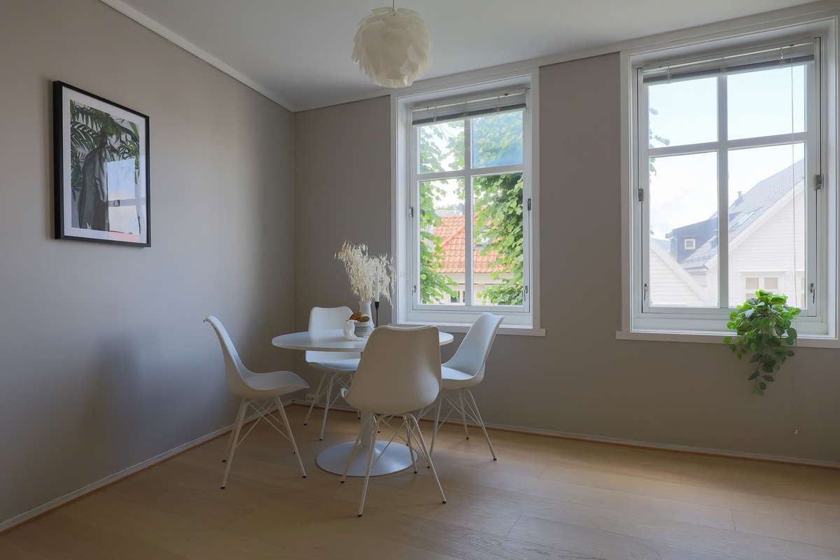 Leiligheten ble nyrenovert for et par år siden og fremstår delikat og sjarmerende. Det er store vinduer på alle rom, og det er godt lysinnslipp. Hvert av soverommene har fint plass til en dobbelseng og garderobe/arbeidspult. Kjøkkenet har kombiskap og vaskemaskin, og alle hvitevarer er inkludert i husleien.