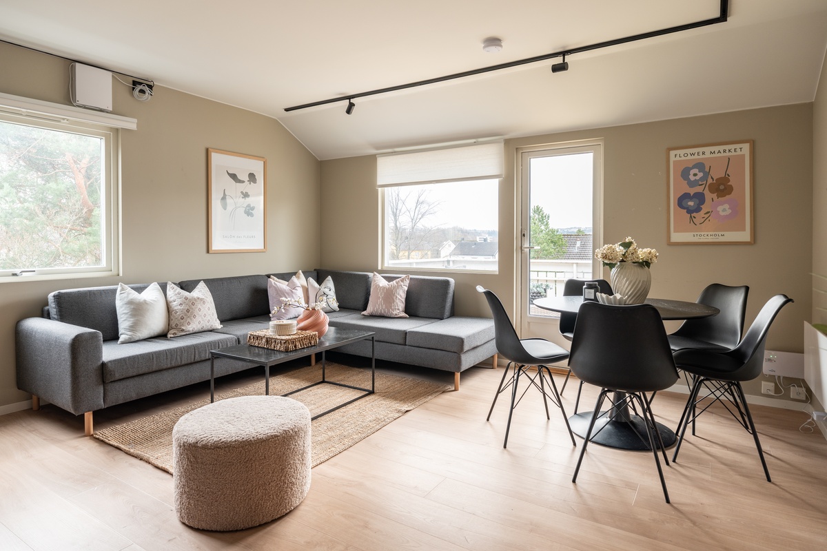 Fellesareal er møblert med blant annet sofa, sofabord, spisebord og spisestoler. Integrerte hvitevarer på kjøkken. Vaskemaskin og tørketrommel inkludert.