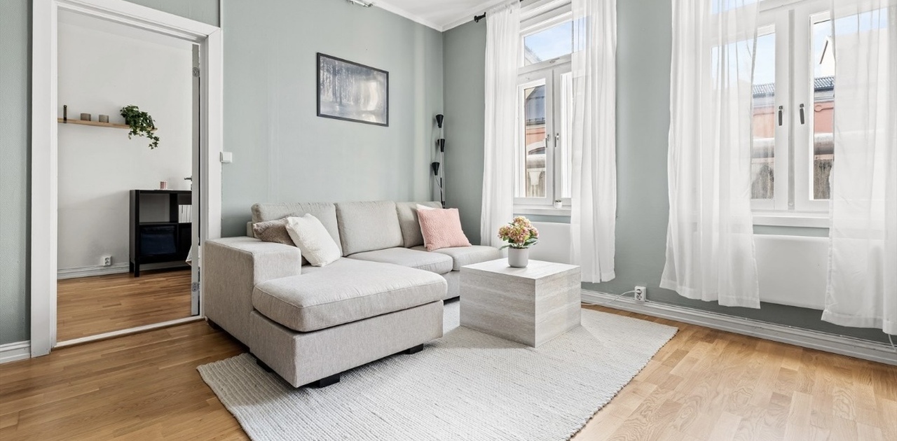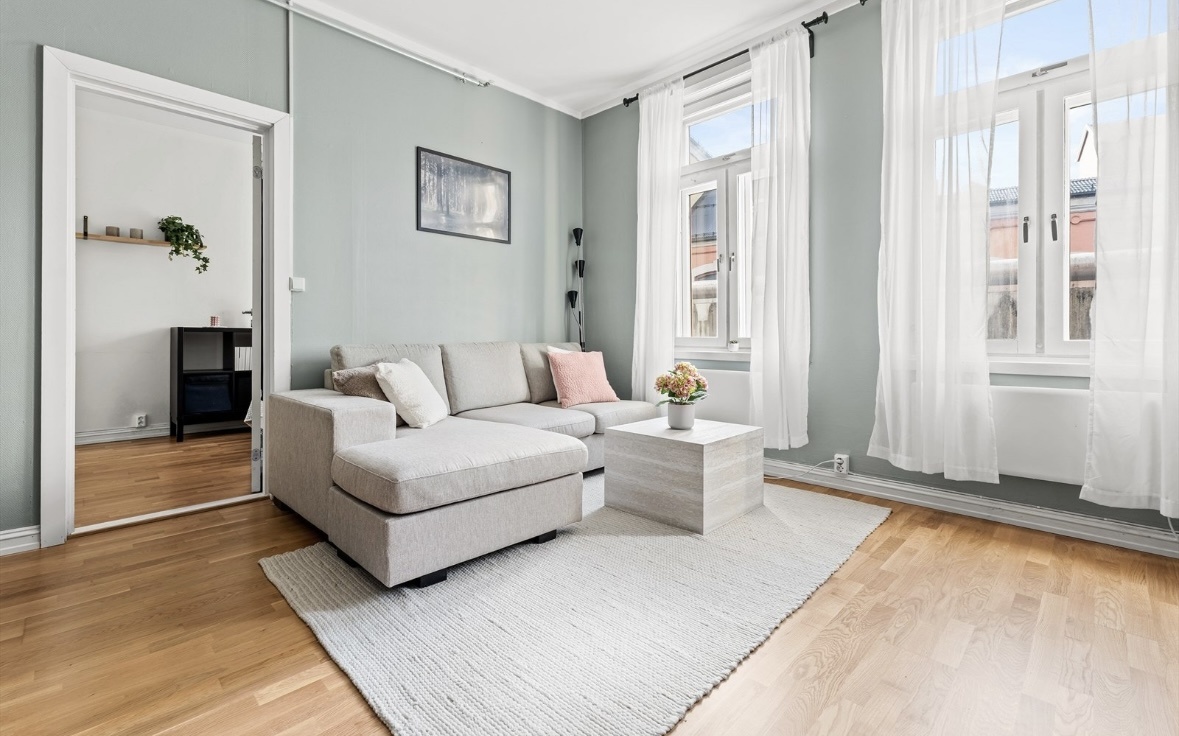 Lys og gjennomgående 3-roms leilighet med mye sjarm og god romfølelse. Leiligheten har store vinduer, høy takhøyde (ca. 2,68 m) og en åpen planløsning som gjør den både luftig og hyggelig å bo i.