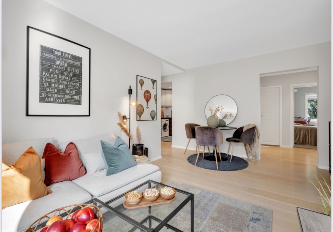Leiligheten er på 71 kvadratmeter og ble totalrenovert i 2018. Både soverommet og fellesarealene er fullt møblert. Soverommet er på 8,7 kvadratmeter og har også en egen balkong. Møblene som kommer med er en garderobe med speil, en stor pult, en stol, en 140 cm seng og møbler til balkongen (soverom nr. 1 på tegningen). Ellers har leiligheten en stue, moderne kjøkken og bad. Det er et gratis vaskerom i bygget og en bod for oppbevaring.
