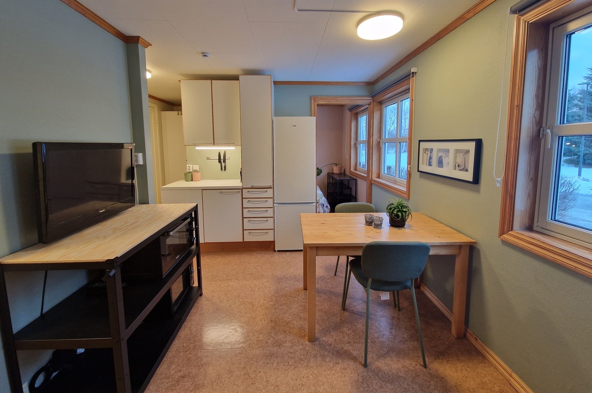 The 25 m² apartment is located on the ground floor at Frode Rinnans veg 82 at Moholt. It has a combined living room and kitchen, a separate bedroom, and a separate bathroom. The bathroom was renovated in 2025. There is floor heating in all rooms and good ventilation/air quality.