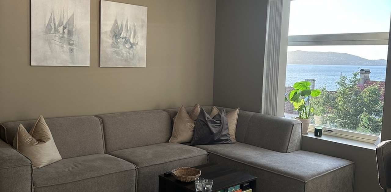 Fullt møblert 3-roms med sjøutsikt og balkong | God standard | Sentral beliggenhet | Felles flott hage