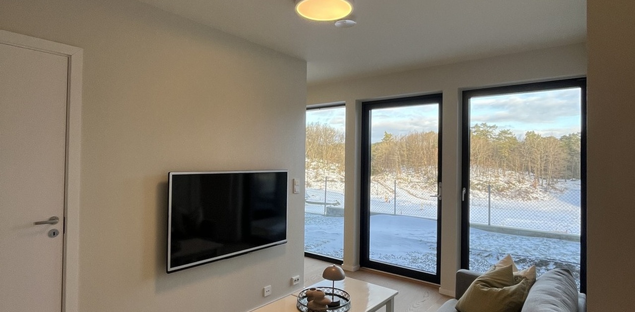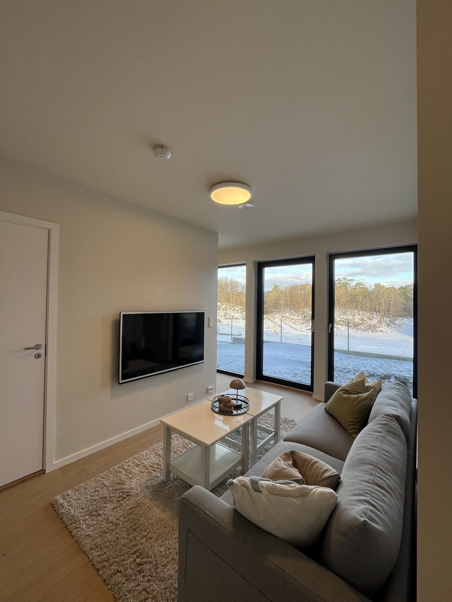 Store vinduer, mye lysinnslipp og høy takhøyde gir svært god romfølelse. Nb: grdiner, skapdører og dimbare lysbrytere skal monteres. Det er ekstra lydisolasjon i vegger og tak. Det er integrert balansert ventilasjon med varmegjenvinning som gir jevn og frisk luft i alle rom og godt inneklima.