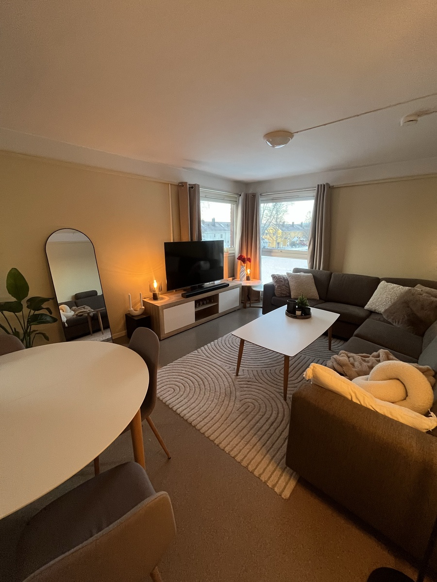 Leiligheten er på ca. 50 kvm, den er delvis møblert og har egen vaskemaskin. Leiligheten passer godt for både enslige og par. Vann og internett er inkludert i husleien. Strøm kommer i tillegg.