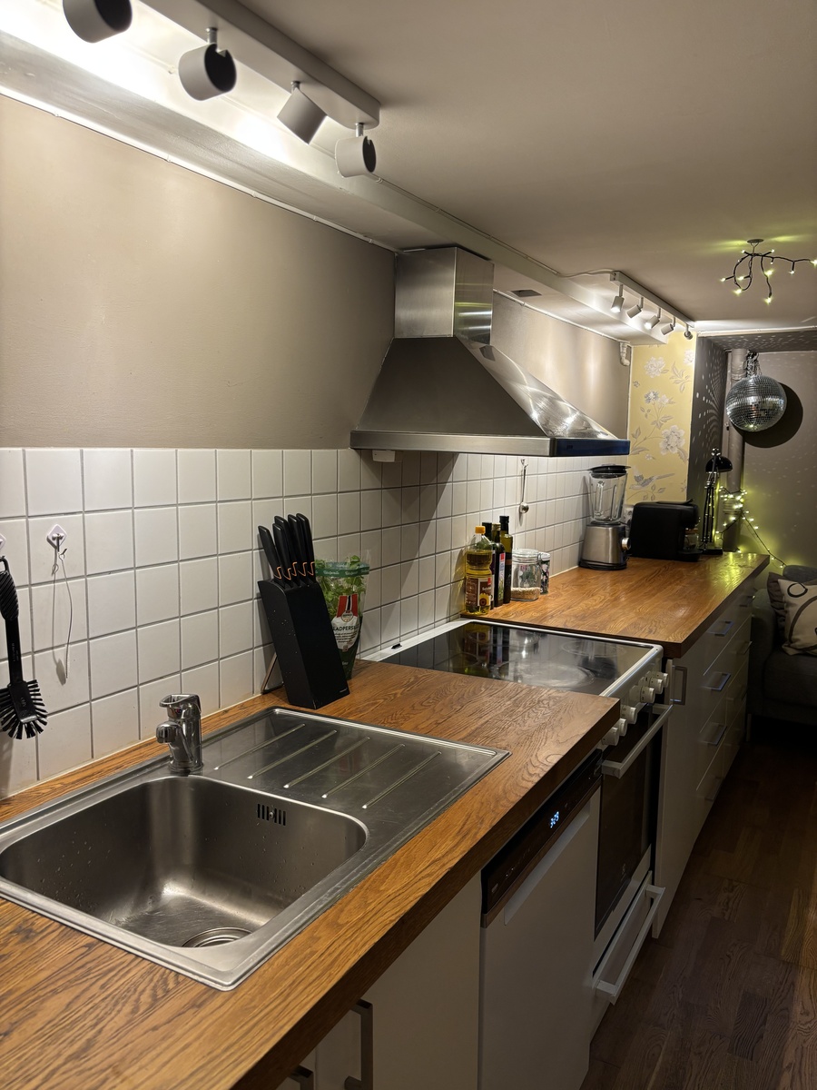Vi bor i en sokkelleilighet rett ved UiO, med kort vei til både butikk, trikk og T-bane, er derfor enkelt og raskt å komme seg rundt.